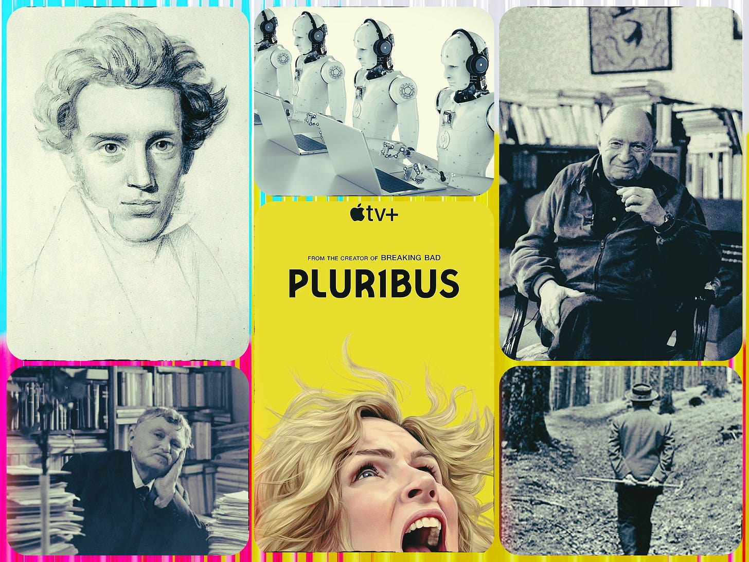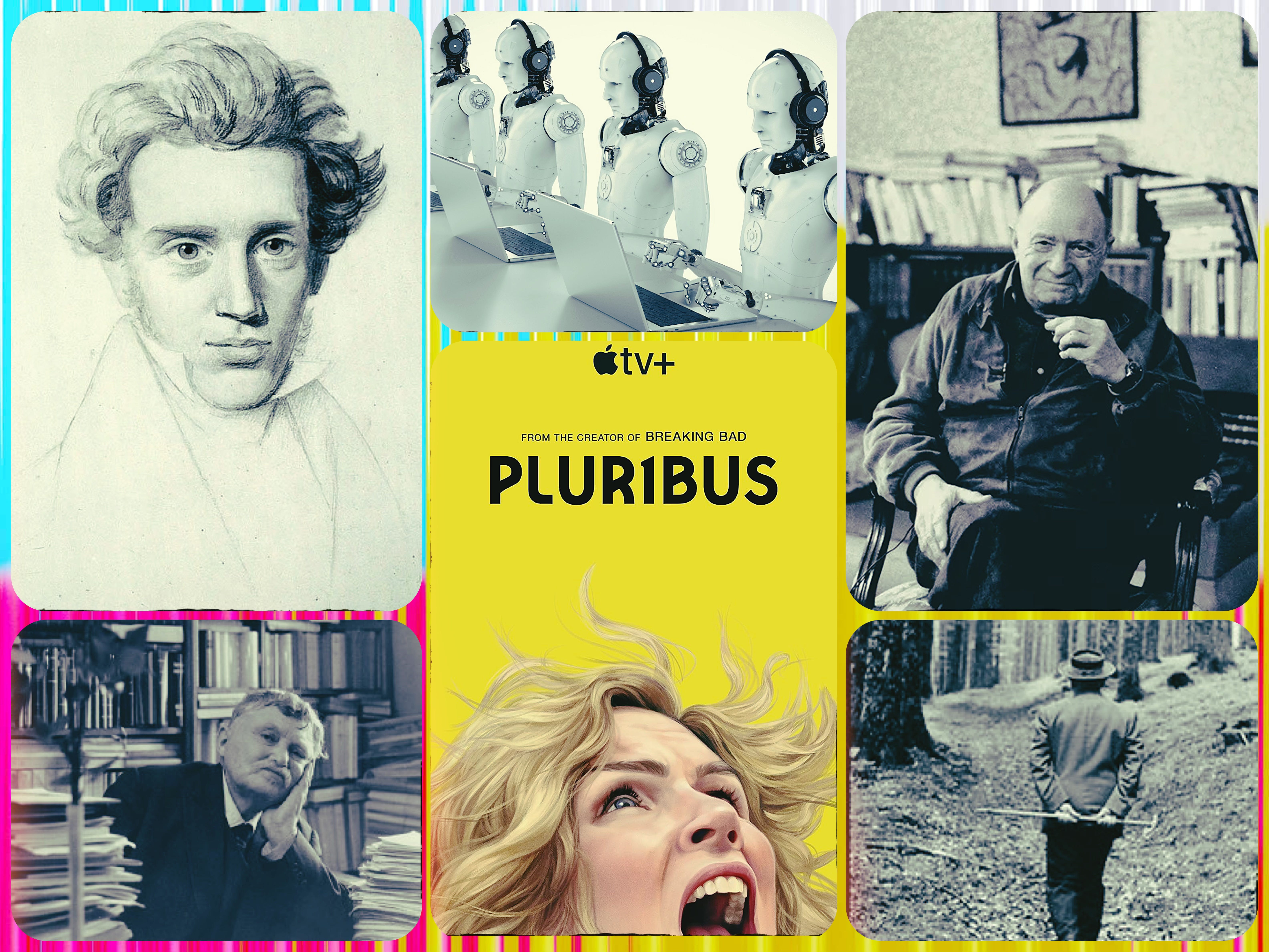 Indeed, long before Pluribus, a series of thinkers lodged a loosely affiliated attack against mass society, insisting that human meaning begins from lived, embodied, first-person existence, rather than from abstract systems (philosophical, bureaucratic, technological, ideological, etc.) that claim to explain or to manage life from above. These novelists, philosophers, poets, and theologians are often grouped under the heading of “existentialism.” Scholars have long debated whether or not this catchall term is suitable for such a disparate collection of figures, but, in this case, its breadth is useful. For it gestures towards the diversity and thus the prevalence of the existentialist protest against mass systems.